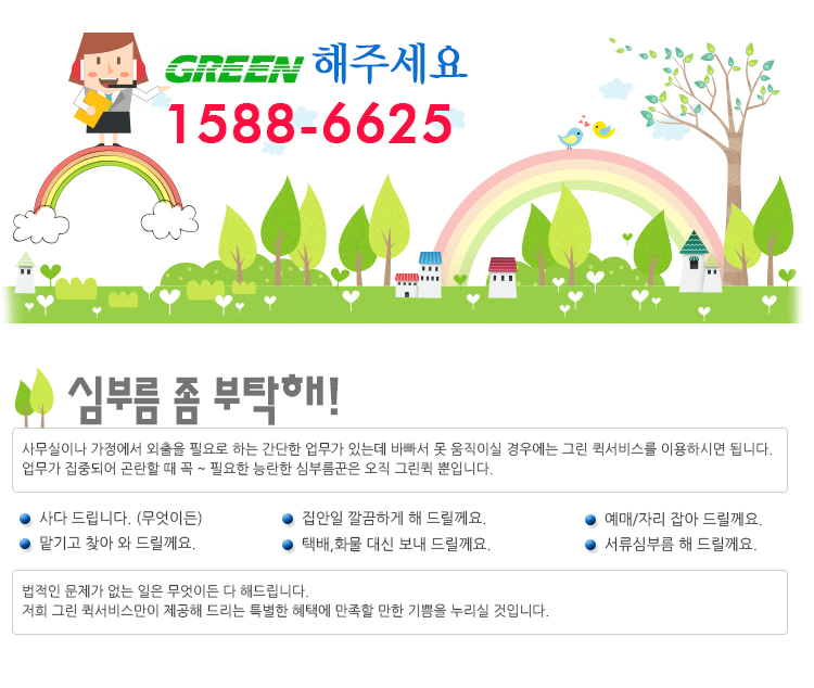 »óÈ£¸í ±×¸°Äü¼­ºñ½º | ´ëÇ¥ÀÚ ÀÌö | »ç¾÷ÀÚµî·Ï¹øÈ£ 107-10-07749 | TEL 1588-6625 | FAX 02-2637-6625 | ADD ¼­¿ïƯº°½Ã µ¿´ë¹®±¸ ÇÏÁ¤·Î 10